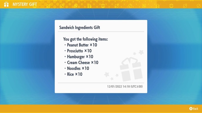 Nintendo have released a Mystery Gift code for sandwich ingredients for Pokémon Scarlet & Violet. Here it is: HAJ1MEOR1G1NAL
